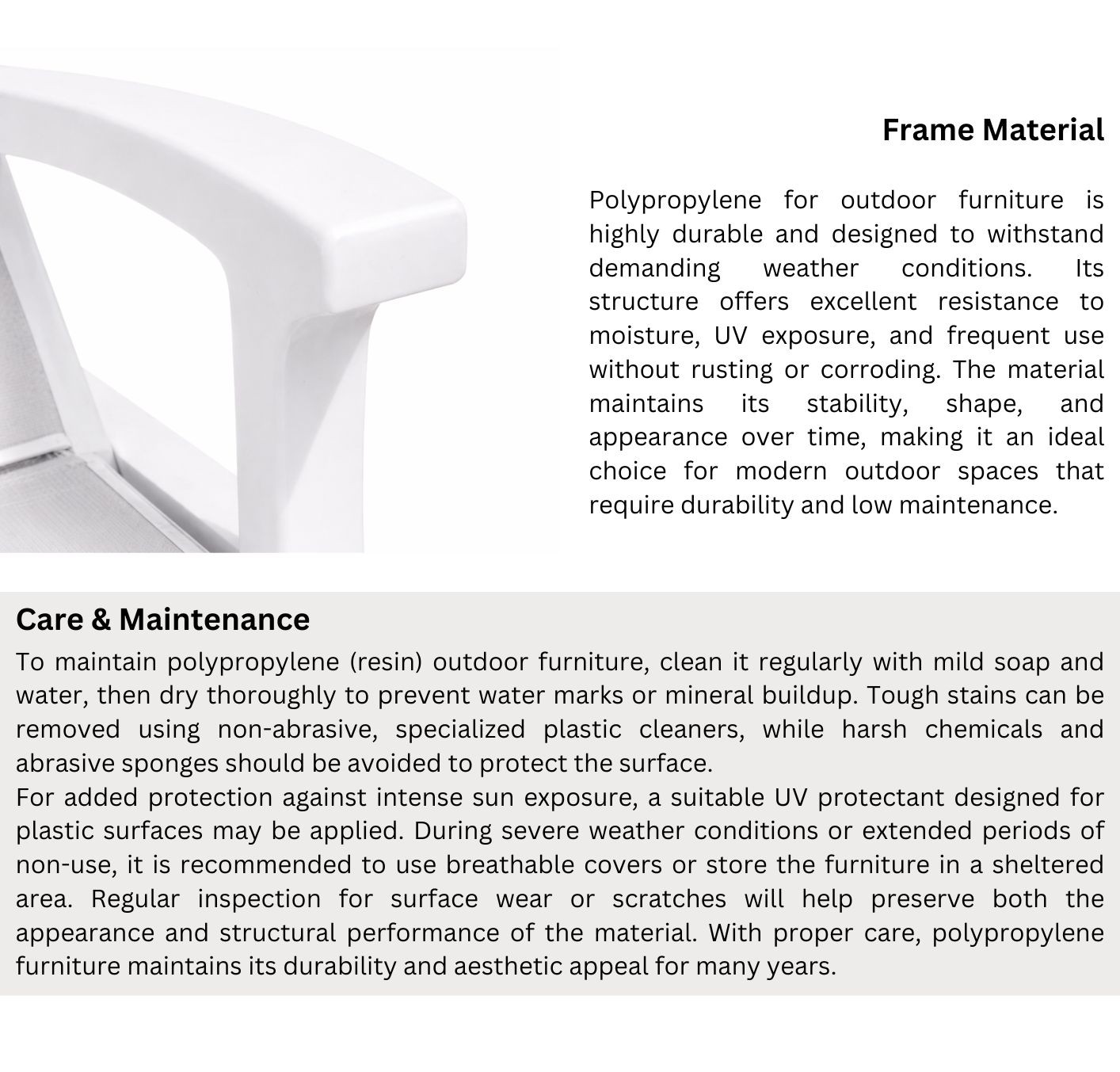 Outdoor chairs made from polypropylene are designed to withstand weather conditions and everyday use. To maintain them properly, regular cleaning with lukewarm water and mild soap is recommended, using a soft cloth or sponge. Avoid harsh chemicals, solvents, or abrasive cleaners, as they may affect the surface and color of the material. If placed near swimming pools or the sea, frequent rinsing with fresh water is advised to remove salt and chlorine residues that may affect the surface over time. To preserve both appearance and structural stability, avoid excessive weight stress and contact with sharp objects. During winter months or extended periods of non-use, it is recommended to store the chairs in a covered area or protect them with appropriate outdoor covers.