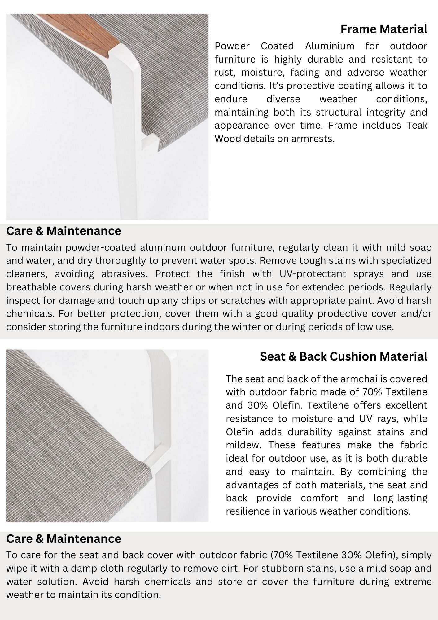 They are made of aluminium with teak inserts on handles.The seat and back cushions are not removable from the frame and are made from textline and olefin fabric.