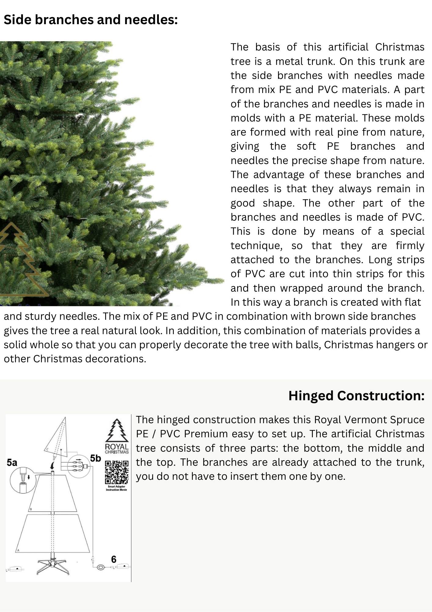 The artificial Christmas tree Asak is a natural looking artificial Mix Pine tree with multiple shades of green (Mix Pine needles).You can assemble this artificial Christmas tree very fast by the hinged construction. In this construction the branches are pre-assembled in brackets with a hinge attached to it. The branches fall into the right place as soon as you put the tree up. All you have to do is fold out the small branches so that it becomes a fully shaped artificial Christmas tree.The basis of the Christmas tree is a metal stand. A part of the branches and needles is made in molds with a PE material so that it will give the precise shape from nature. The branches contain various of colors of green/light green to give a natural look! The other part of the branches and needles is made of PVC so they are firmly attached to the branches. This way a branch is created with flat and sturdy needles. This combination of materials provides a solid whole so you can decorate your tree safely with many Christmas decorations.