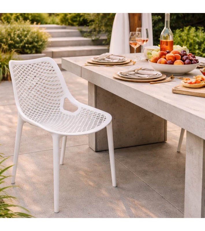 The Outdoor Armchair Air White is a modern and practical choice for outdoor spaces that require durability and timeless design. Measuring L57 x W60 x H81 cm, it offers a comfortable seating position with an ergonomic backrest, making it ideal for gardens, terraces, pool areas, and professional hospitality settings such as cafés and restaurants. Its clean lines and lightweight aesthetic define its contemporary character, while the white finish enhances brightness and a sense of clarity in any setting. It blends effortlessly with minimal, modern, and summer-inspired outdoor arrangements and pairs easily with a variety of outdoor tables and finishes. Air White is a reliable solution for everyday residential and professional use, combining functionality with refined outdoor style.