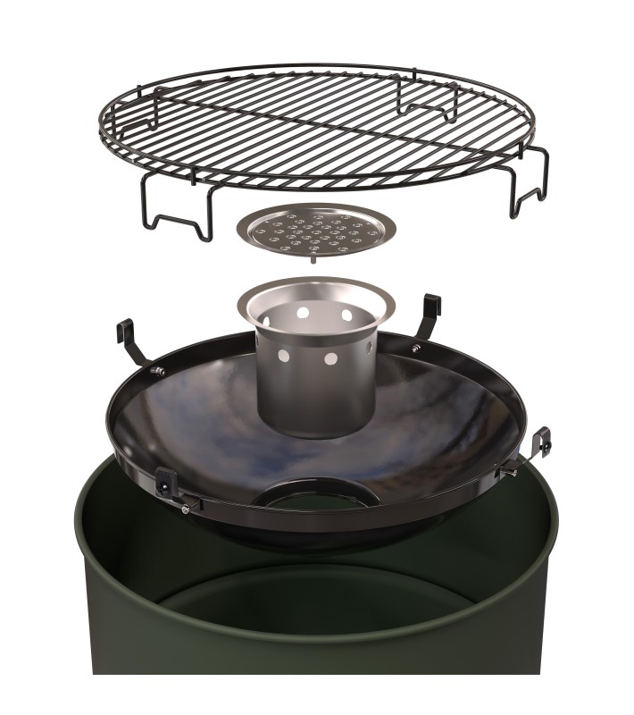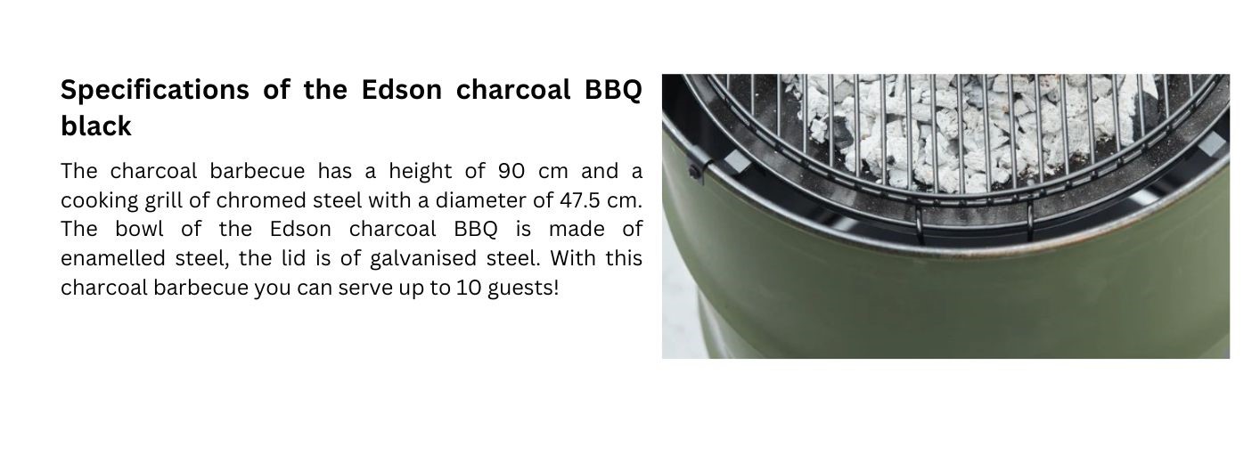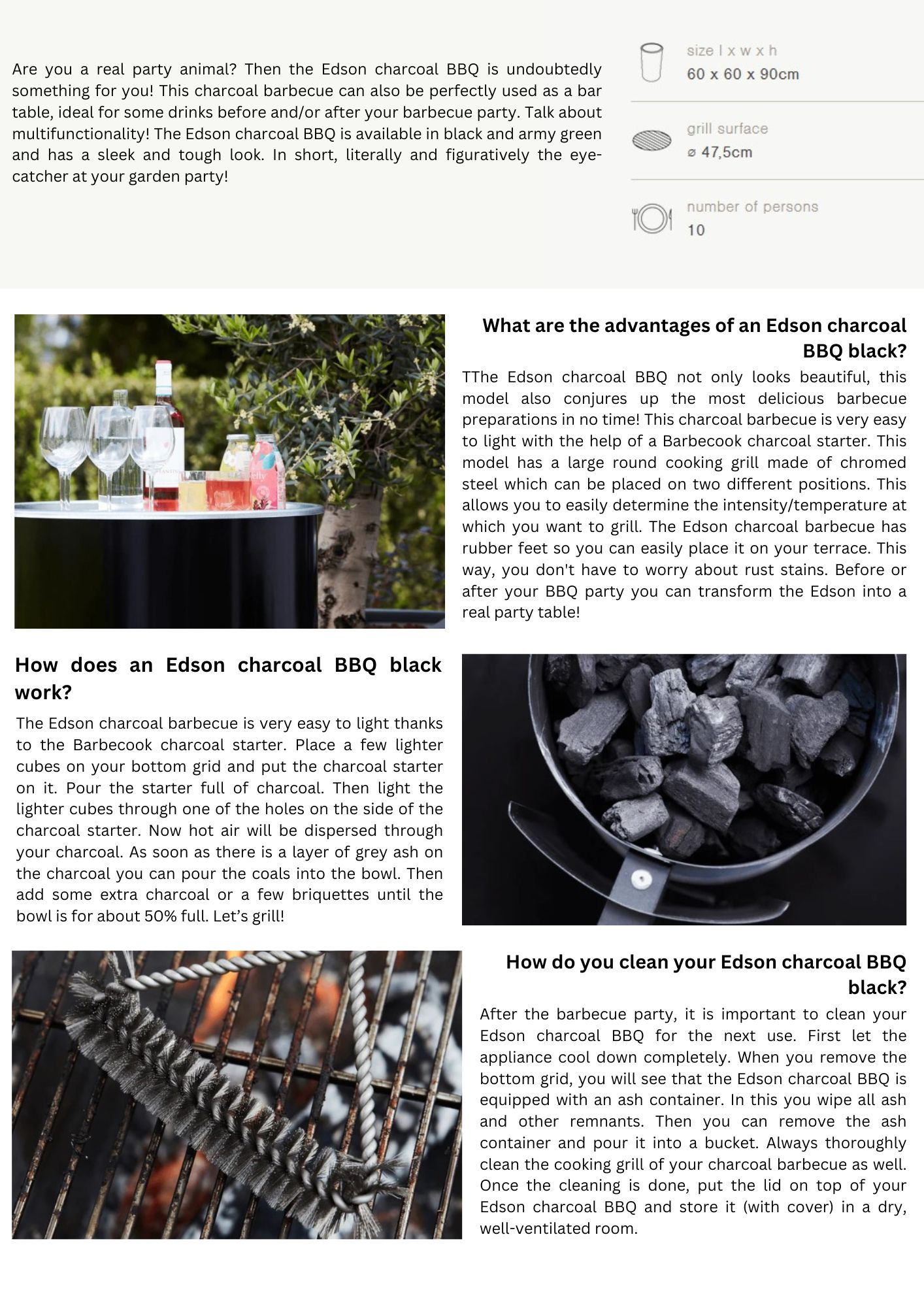 Edson is an eye-catcher at every party! This multi-functional drum can be converted from a barbecue to a party table in no time at all. Ideal for enjoying a drink before or after your barbecue party. This charcoal barbecue is very easy to light with the help of a Barbecook charcoal-starter. This model has a large round cooking grill made of enamelled steel which can be placed on two different positions. This allows you to easily determine the intensity/temperature at which you want to grill. The Edson charcoal barbecue has rubber feet so you can easily place it on your terrace. This way, you don't have to worry about rust stains. Very easy to light thanks to the Barbecook charcoal starter. Place a few lighter cubes on the bottom grid of the barbeque and put the "charcoal-starter" on it. Pour the starter full of charcoal. Then light the lighter cubes through one of the holes on the side of the charcoal starter. Now hot air will be dispersed through your charcoal. As soon as there is a layer of grey ash on the charcoal you can pour the coals into the bowl. Then add some extra charcoal or a few briquettes until the bowl is about 50% full. Let’s grill!