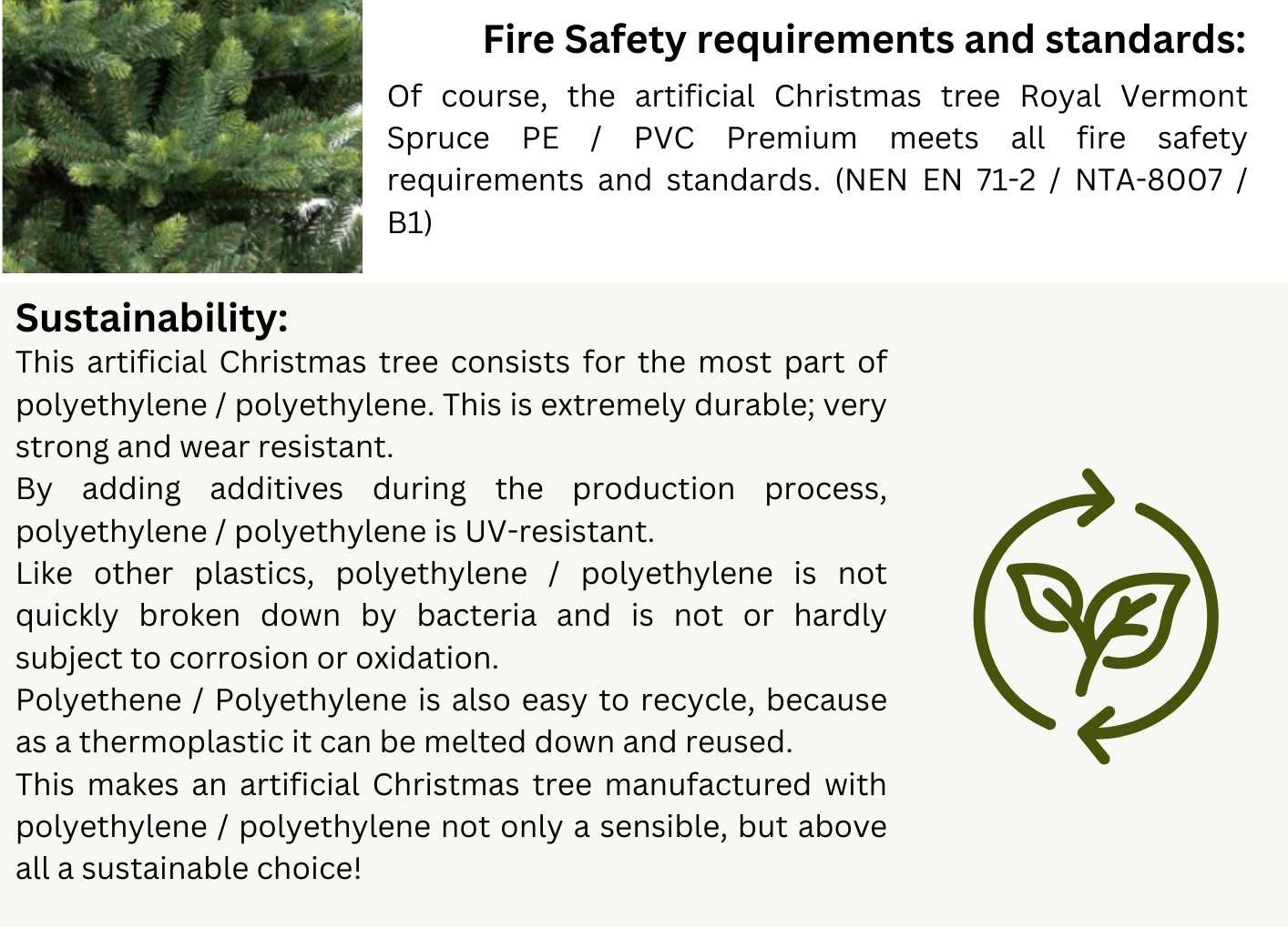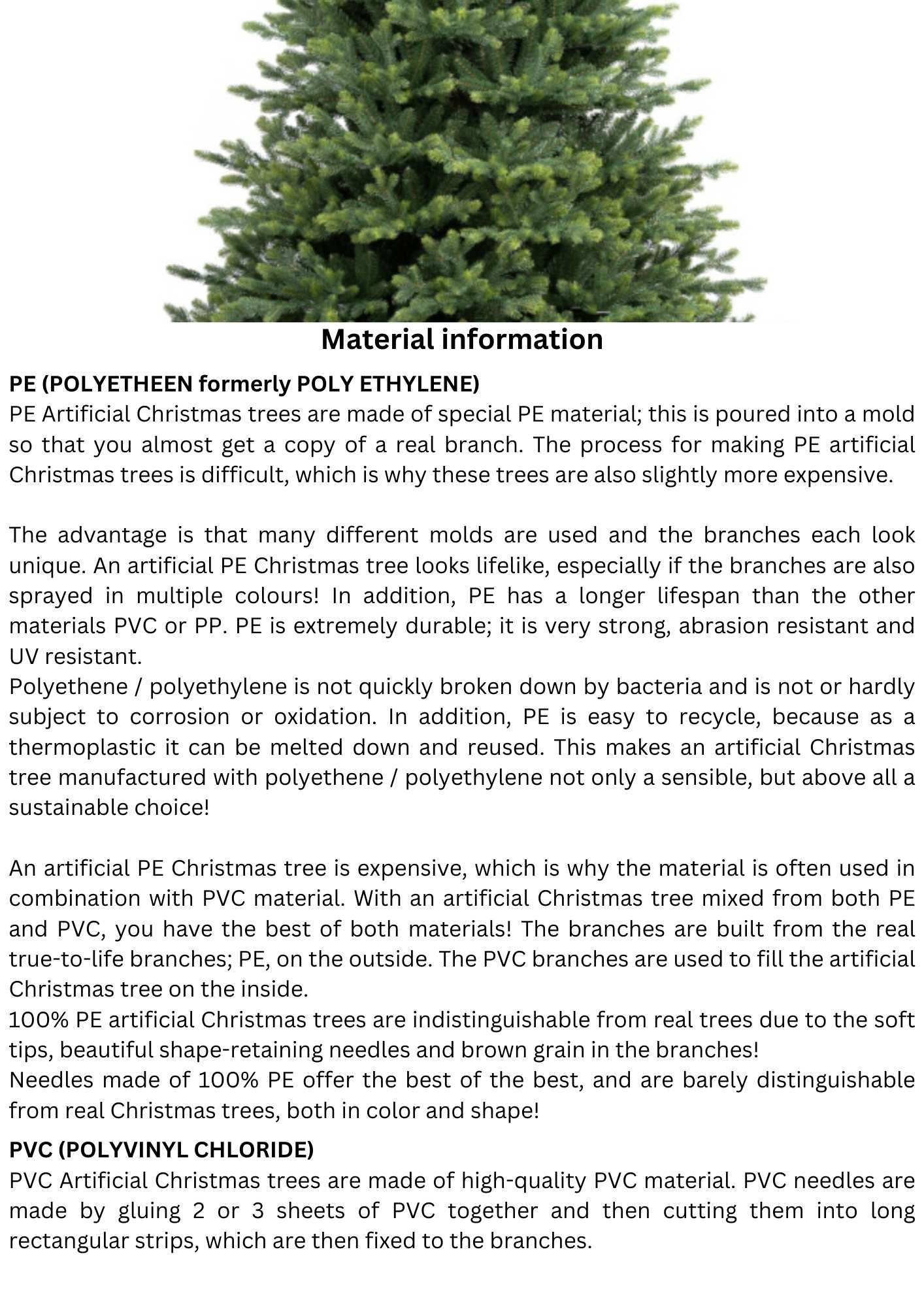 The artificial Christmas tree Royal Vermont Spruce PE / PVC Premium is a natural looking artificial Christmas tree. This wide model artificial Christmas tree has a whimsical and irregular structure, just like the real pine trees from nature have. This artificial Christmas tree has pointed branches and is ideal for many different types of decoration.