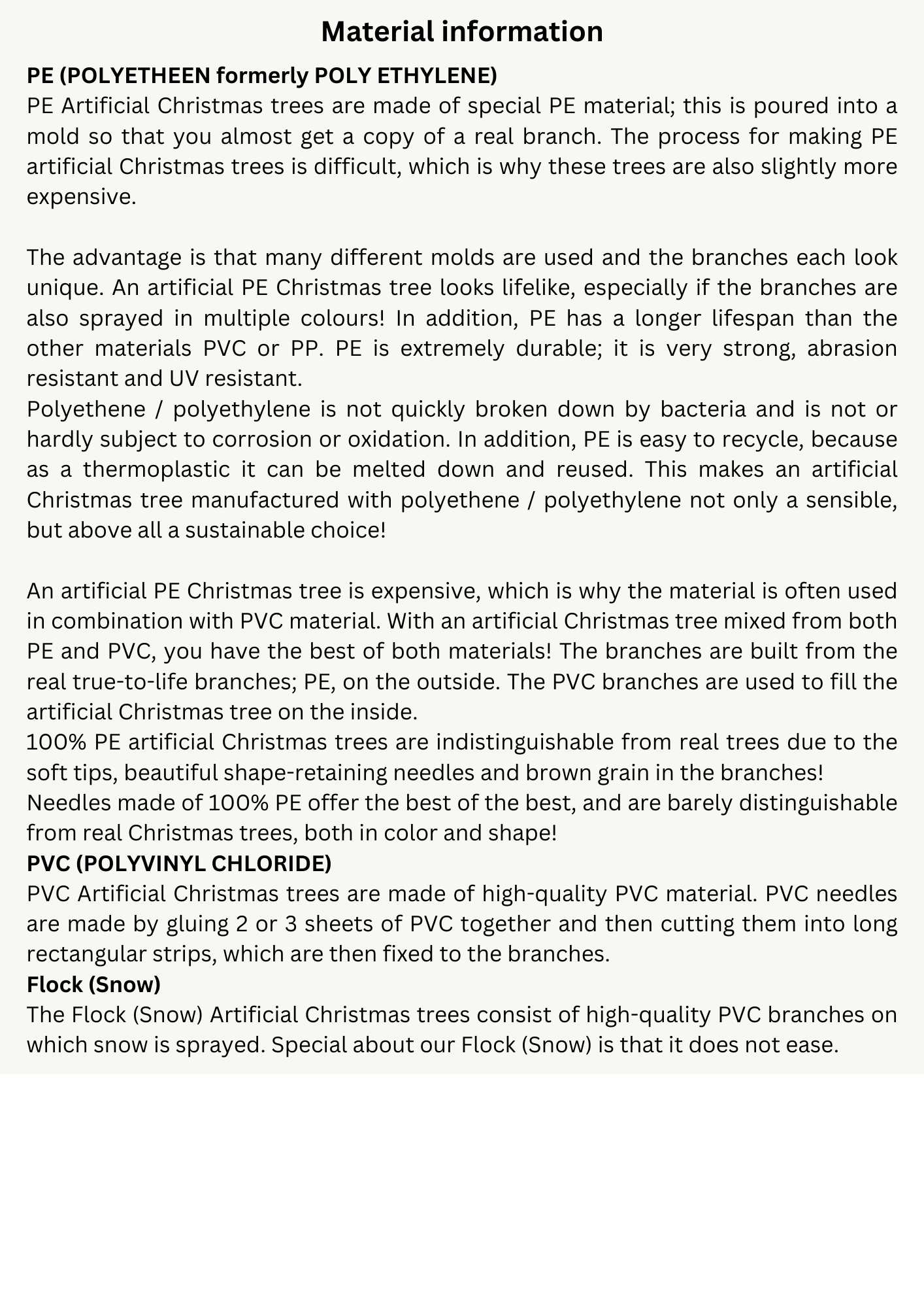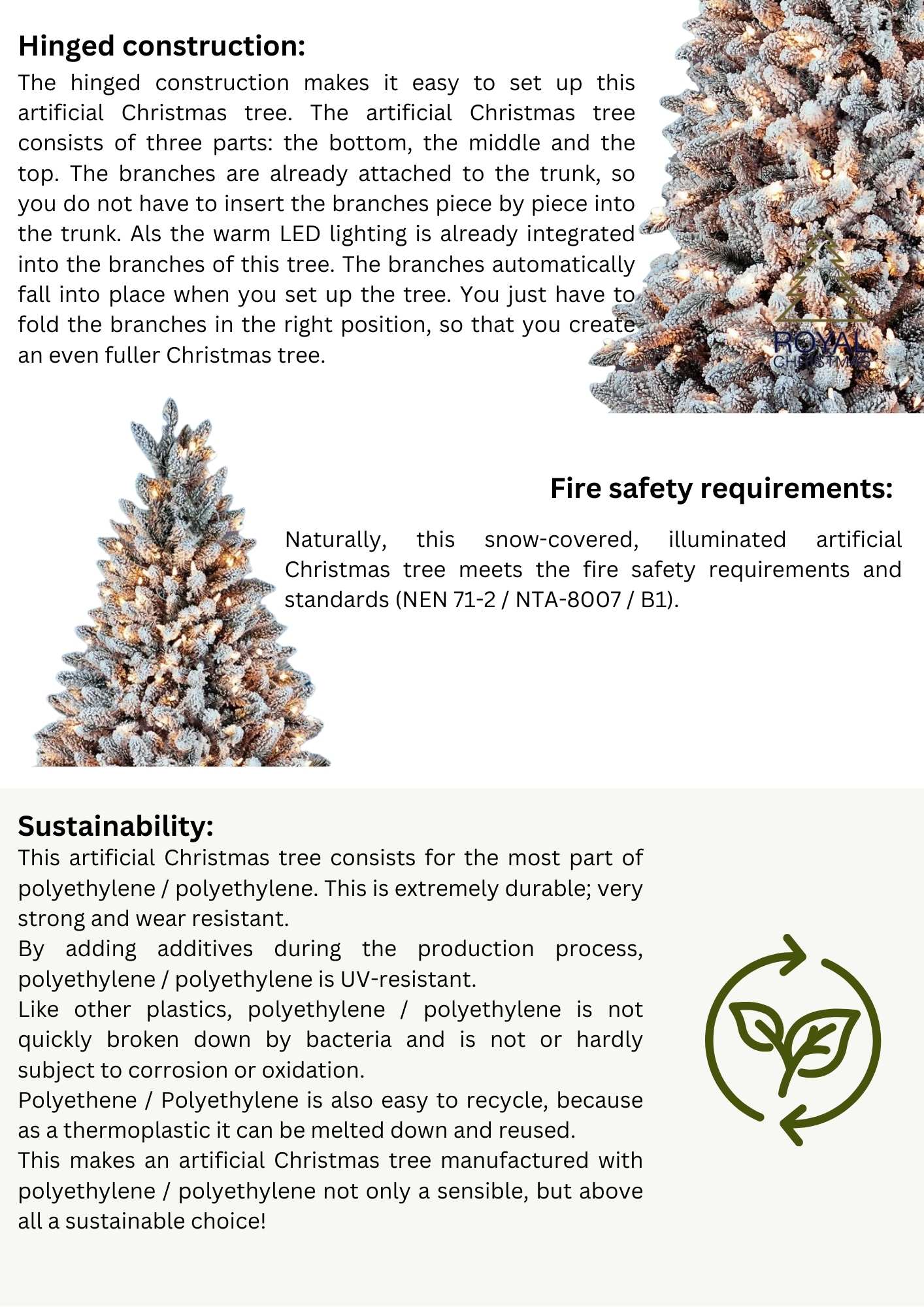 The artificial Christmas tree Edel Spruce PE / PVC - Warm LED is a full snowy artificial Christmas tree with unique design. This plastic Christmas tree is made from high-quality mix PP and PVC material and with integrated warm LED lighting. Because of the strong branches you can easily hang many decorations. The branches are sprinkled with a layer of snow. This way you always have a white Christmas!