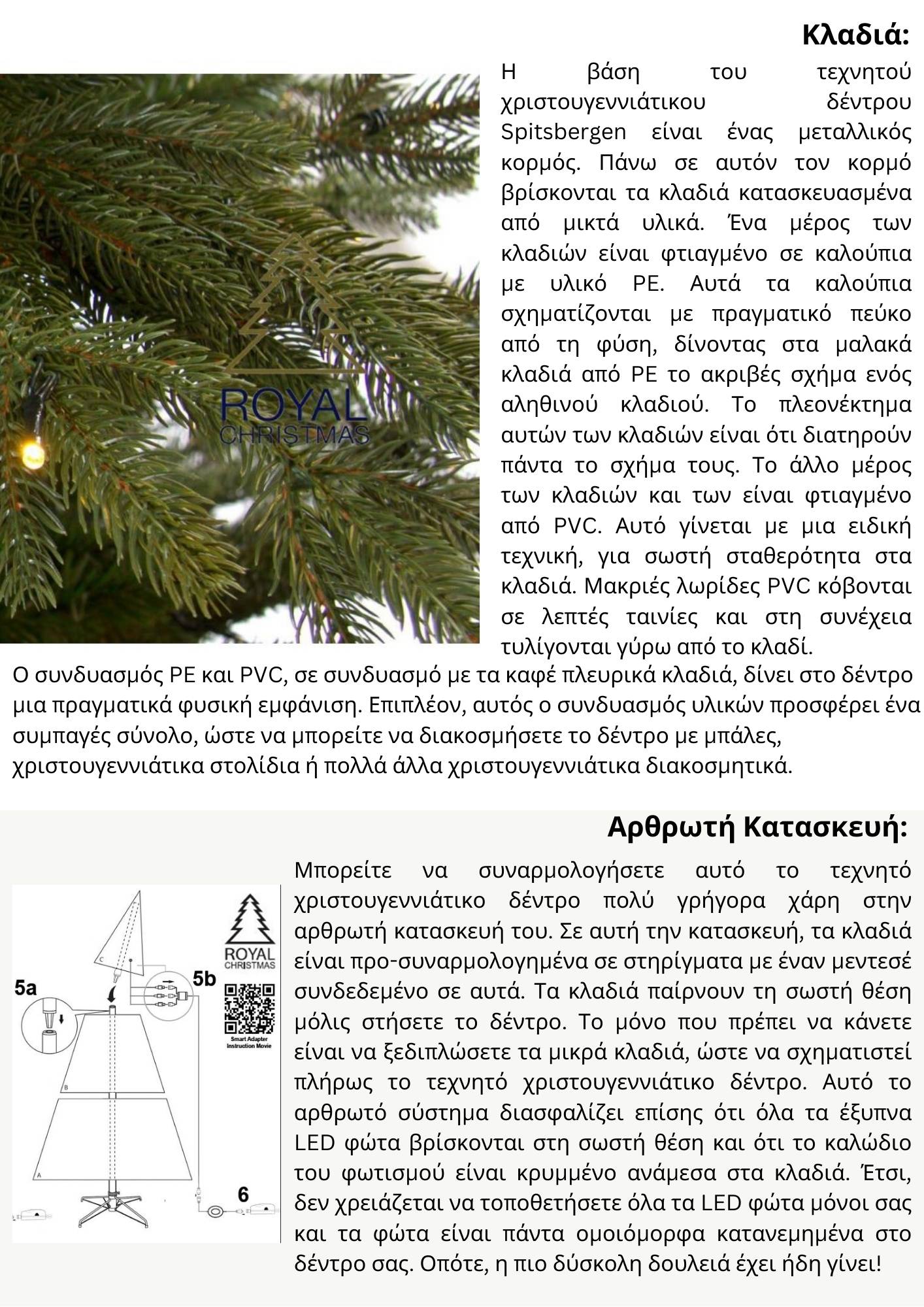 Μπορείτε να συναρμολογήσετε και να φωτίσετε το τεχνητό χριστουγεννιάτικο δέντρο πολύ γρήγορα αφού τα κλαδιά είναι προσυναρμολογημένα σε βραχίονες στο κορμό του δέντρου και υπάρχουν ενσωματωμένα LED λαμπιόνια στα κλαδιά του. Τα κλαδιά πέφτουν στη σωστή θέση μόλις ανεβάσετε το δέντρο. Το μόνο που έχετε να κάνετε είναι να διπλώσετε τα μικρά κλαδιά ώστε να γίνει ένα πλήρως διαμορφωμένο τεχνητό χριστουγεννιάτικο δέντρο. Επιπλέον, με το σύστημα Easy Plug-in, το άναμμα του χριστουγεννιάτικου δέντρου σας είναι τόσο απλό όσο να το συνδέσετε σε μια πρίζα.Δημιουργήστε και ελέγξτε διαφορετικές τάσεις φωτός - συγχρονίστε με τη μουσική σας ή επιλέξτε από μια προ-προγραμματισμένη επιλογή. Το χριστουγεννιάτικο δέντρο Modera έχει ενσωματωμένο μικρόφωνο, σχεδιασμένο να ανιχνεύει ένα ευρύ φάσμα ήχων-δημιουργώντας ένα φωτεινό σόου που είναι εντελώς μοναδικό στη μουσική σας.Η βάση του χριστουγεννιάτικου δέντρου είναι μια μεταλλική βάση. Ένα μέρος των κλαδιών είναι φτιαγμένο σε καλούπια με υλικό PE ώστε να δίνει το ακριβές σχήμα από τη φύση. Τα κλαδιά περιέχουν διάφορα χρώματα πράσινο/ανοιχτό πράσινο για να δώσουν μια φυσική εμφάνιση! Το άλλο μέρος των κλαδιών και των βελόνων είναι κατασκευασμένο από PVC, ώστε να στερεώνονται σταθερά στα κλαδιά. Έτσι δημιουργείται ένα κλαδί με επίπεδες και στιβαρές βελόνες. Αυτός ο συνδυασμός υλικών παρέχει ένα συμπαγές σύνολο ώστε να μπορείτε να διακοσμήσετε το δέντρο σας με ασφάλεια με πολλά χριστουγεννιάτικα στολίδια.Το τεχνητό χριστουγεννιάτικο δέντρο θα παραδοθεί σε κουτί αποθήκευσης στο οποίο μπορείτε εύκολα να αποθηκεύσετε ξανά το δέντρο για τον επόμενο χρόνο μετά τις γιορτές.