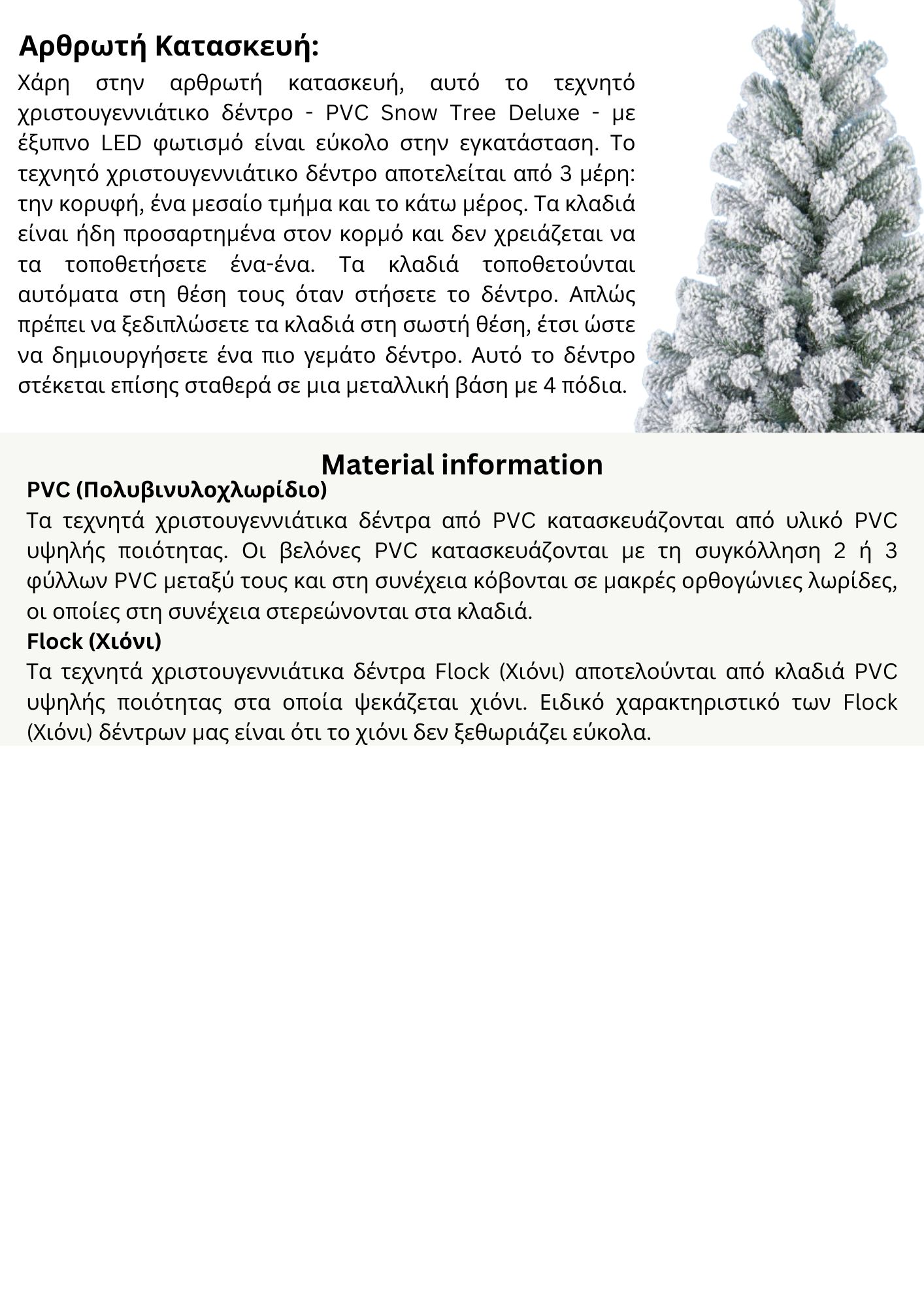 Το τεχνητό χριστουγεννιάτικο δέντρο Asak white είναι ένα τεχνητό χριστουγεννιάτικο δέντρο με φυσική χιονισμένη εμφάνιση με πολλές αποχρώσεις χιονισμένου πράσινου.Το τεχνητό δέντρο έρχετε με ξεχωριστό μεταλλικό κορμό και κλαδιά. Τα κλαδιά είναι χωρισμένα ανά κατηγορία είτε με χρώμα ή με αλφαβητική σειρά. Αυτό σημαίνει ότι απλά γαντζώνετε τα κλαδιά στα στηρίγματα ανάρτησης στον μεταλλικό κορμό, ανά χρώμα ή γράμμα προς γράμμα. Ξεδιπλώνοντας περαιτέρω τα κλαδιά δημιουργείτε ένα όμορφο γεμάτο χριστουγεννιάτικο δέντρο, έτοιμο να διακοσμήσετε με το δικό σας στυλ.Η βάση του χριστουγεννιάτικου δέντρου είναι ένα μεταλλικό stand. Ένα μέρος των κλαδιών και των βελόνων είναι φτιαγμένο σε καλούπια με υλικό PE, ώστε να δίνει το ακριβές σχήμα από τη φύση. Τα κλαδιά περιέχουν διάφορα χρώματα από χιονισμένες πευκοπράσινες/ανοιχτόπράσινες βελόνες για να δώσουν μια φυσική εμφάνιση! Το άλλο μέρος των κλαδιών και των βελόνων είναι κατασκευασμένο από PVC ώστε να στερεώνονται σταθερά στα κλαδιά. Με αυτόν τον τρόπο δημιουργείται ένα κλαδί με επίπεδες και στιβαρές βελόνες. Αυτός ο συνδυασμός υλικών παρέχει ένα συμπαγές σύνολο ώστε να μπορείτε να διακοσμήσετε το δέντρο σας με ασφάλεια με πολλά Χριστουγεννιάτικα στολίδια.