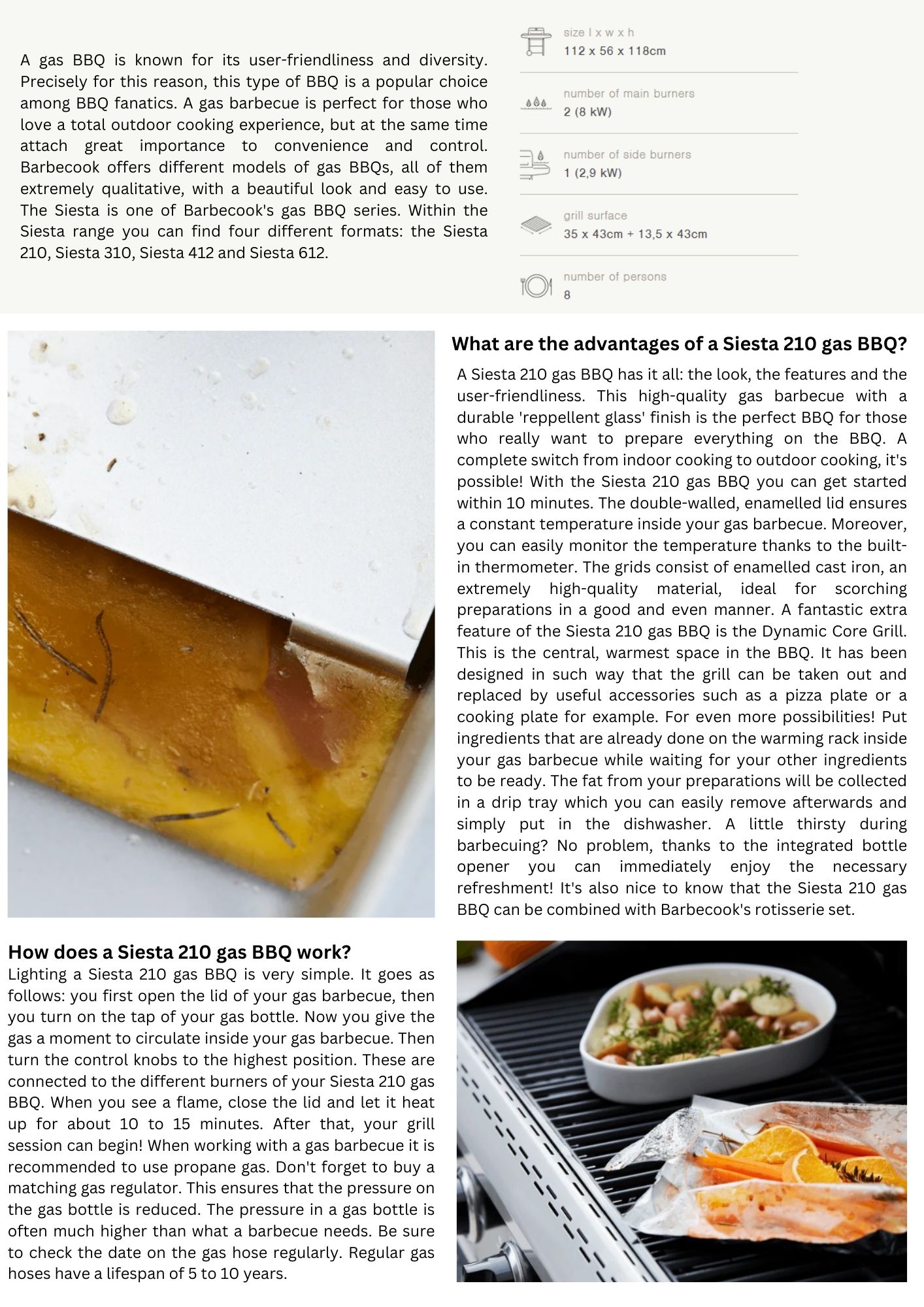 A Siesta 210 gas BBQ has it all: the look, the features and the user-friendliness. This high-quality gas barbecue with a durable 'reppellent glass' finish is the perfect BBQ for those who really want to prepare everything on the BBQ. A complete switch from indoor cooking to outdoor cooking, it's possible! With the Siesta 210 gas BBQ you can get started within 10 minutes. The double-walled, enamelled lid ensures a constant temperature inside your gas barbecue. Moreover, you can easily monitor the temperature thanks to the built-in thermometer. The grids consist of enamelled cast iron, an extremely high-quality material, ideal for scorching preparations in a good and even manner. A fantastic extra feature of the Siesta 210 gas BBQ is the Dynamic Core Grill. This is the central, warmest space in the BBQ. It has been designed in such way that the grill can be taken out and replaced by useful accessories such as a pizza plate or a cooking plate for example. For even more possibilities! Put ingredients that are already done on the warming rack inside your gas barbecue while waiting for your other ingredients to be ready. The fat from your preparations will be collected in a drip tray which you can easily remove afterwards and simply put in the dishwasher. A little thirsty during barbecuing? No problem, thanks to the integrated bottle opener you can immediately enjoy the necessary refreshment! It's also nice to know that the Siesta 210 gas BBQ can be combined with Barbecook's rotisserie set.