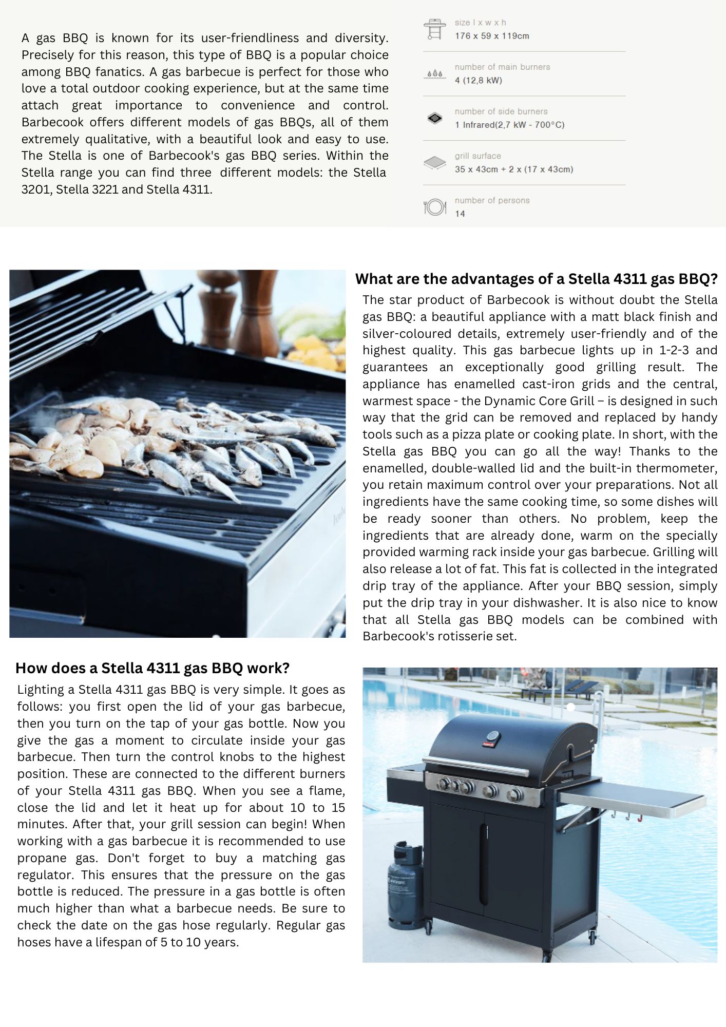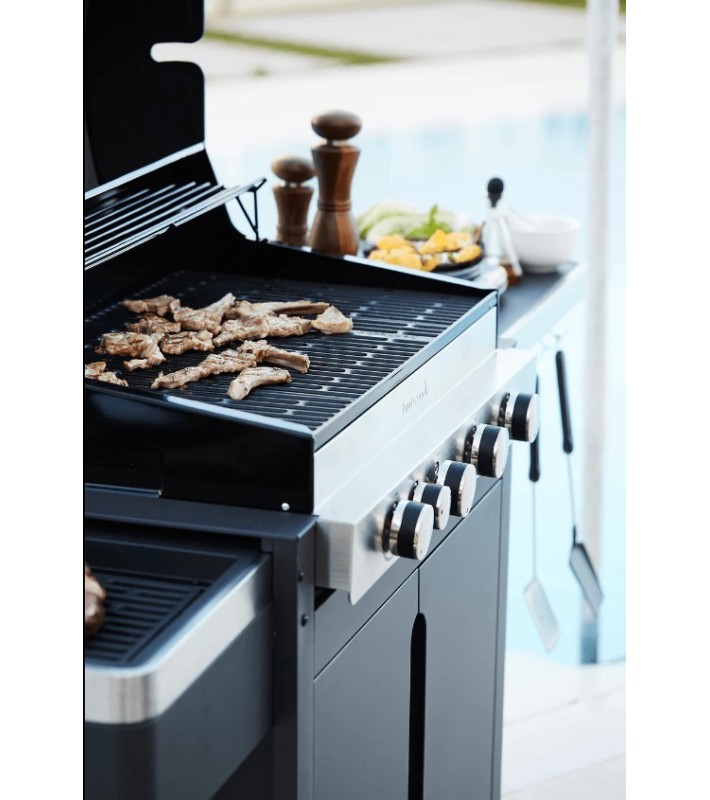 A gas BBQ is known for its user-friendliness and diversity. Precisely for this reason, this type of BBQ is a popular choice among BBQ fanatics. A gas barbecue is perfect for those who love a total outdoor cooking experience, but at the same time attach great importance to convenience and control. Barbecook offers different models of gas BBQs, all of them extremely qualitative, with a beautiful look and easy to use. The Stella is one of Barbecook's gas BBQ series. The dimensions of the barbecue L176 x W59 x H119cm , grill surfase 35 x 43 cm + 2 x( 17x43cm). The main 4 burners boast a power of 12.8 kW, while the side infrared burner has a power of 2.7 kW. The appliance has enamelled cast-iron grids and the central, warmest space - the Dynamic Core Grill – is designed in such way that the grid can be removed and replaced by handy tools such as a pizza plate or cooking plate. In short, with the Stella gas BBQ you can go all the way! Thanks to the enamelled, double-walled lid and the built-in thermometer, you retain maximum control over your preparations. Grilling will also release a lot of fat. This fat is collected in the integrated drip tray of the appliance. After your BBQ session, simply put the drip tray in your dishwasher. It is also nice to know that all Stella gas BBQ models can be combined with Barbecook's rotisserie set.