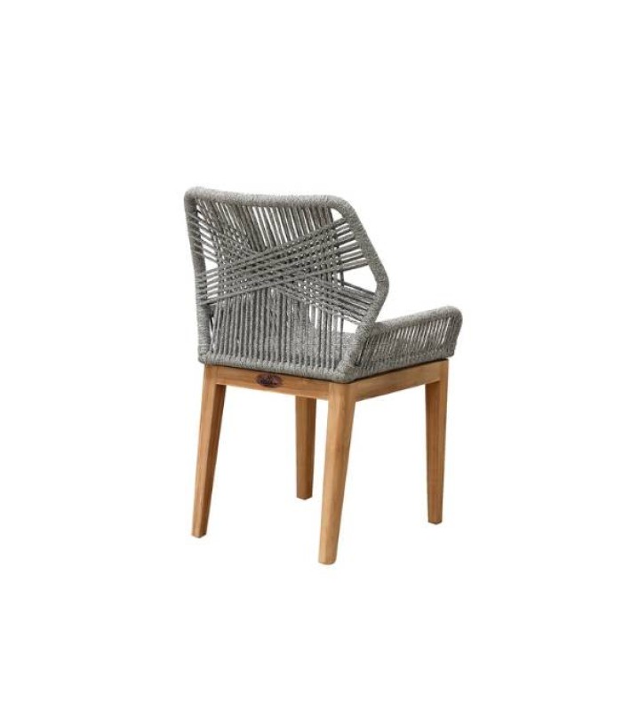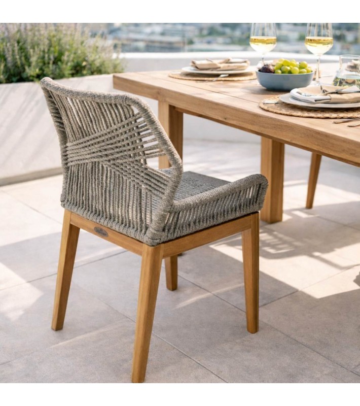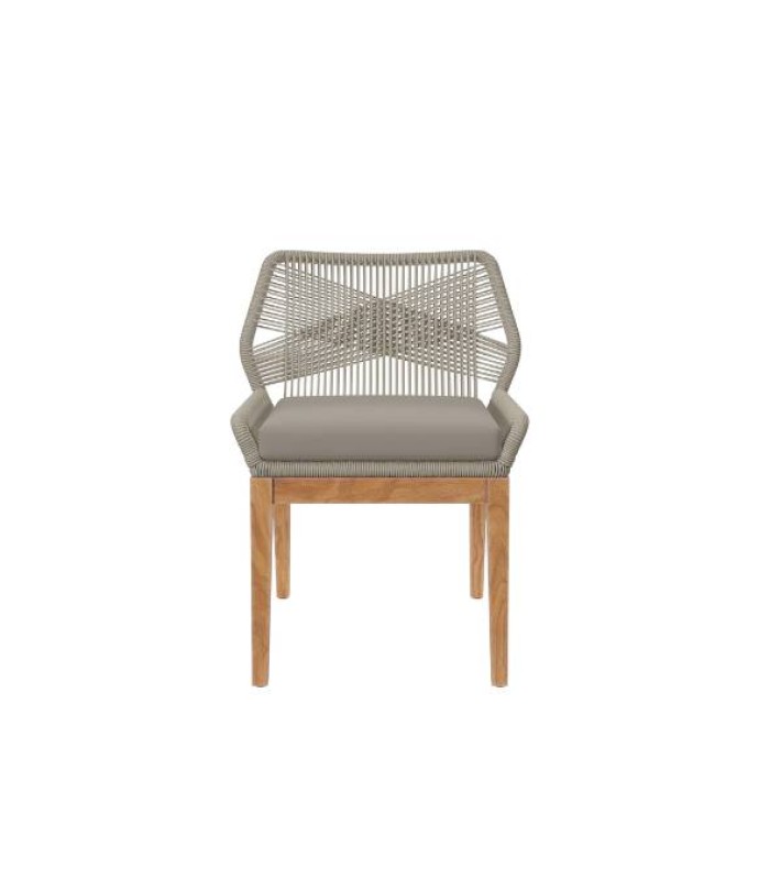 The Chloe Outdoor Armchair in Light Grey blends contemporary design with natural, high-quality materials, creating a refined and timeless piece for any outdoor setting. Crafted from solid teak wood, the frame offers exceptional durability and natural resistance to moisture and outdoor conditions, making it ideal for gardens, verandas, patios, and hospitality spaces. The backrest and armrests are finished with woven olefin rope in a soft light grey tone — a premium material known for its strength, UV resistance, and ability to maintain its color and structure over time. The comfortable seat cushion enhances relaxation while maintaining a clean and elegant silhouette. With its balance of minimal lines and warm natural textures, the Chloe armchair is a sophisticated addition to modern outdoor dining and lounge areas.