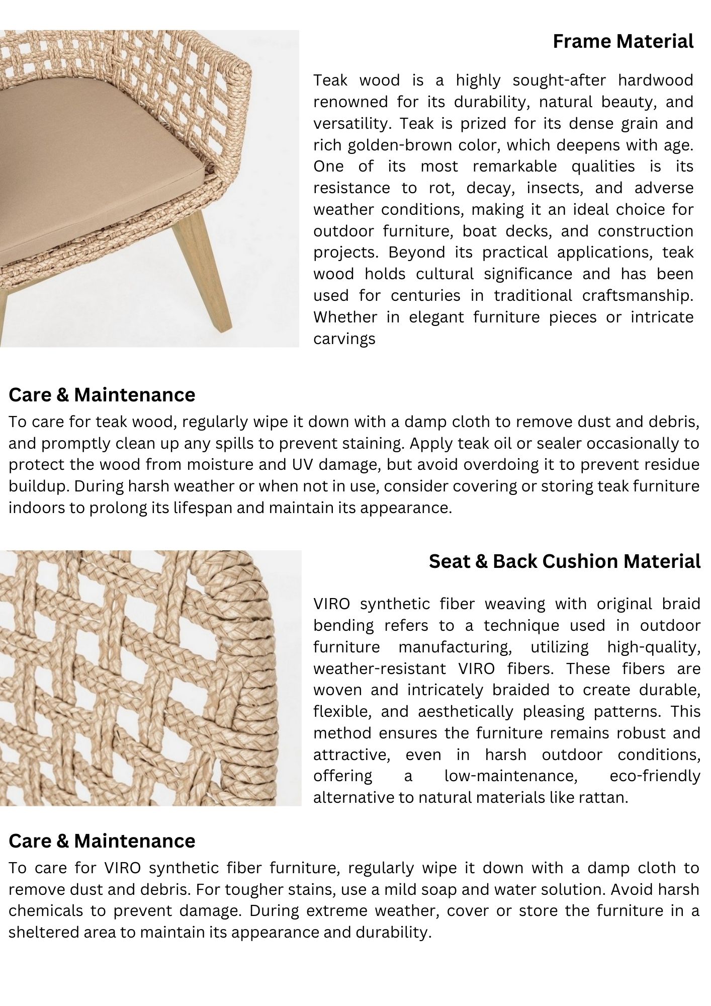 To care for your teak wood and polyester grid outdoor chairs, regularly clean the teak frame with mild soap and water, and use a teak sealant annually to maintain its color. For the polyester grid, clean with a mild soap solution and treat stains promptly with a suitable fabric cleaner. During harsh weather, cover or store the chairs indoors to extend their lifespan. Inspect both the wood and grid regularly for any signs of damage, addressing issues promptly to ensure lasting durability and appearance.