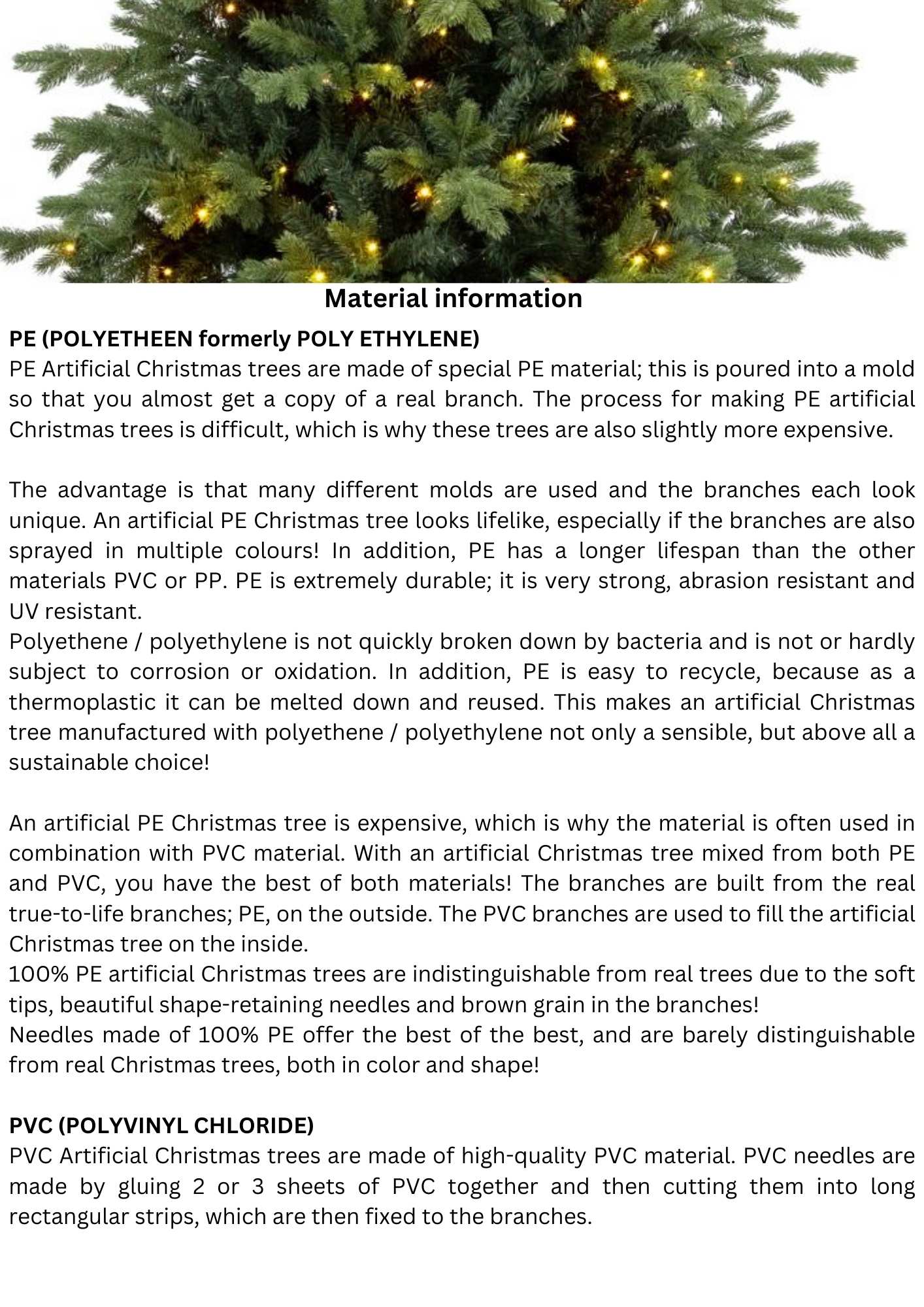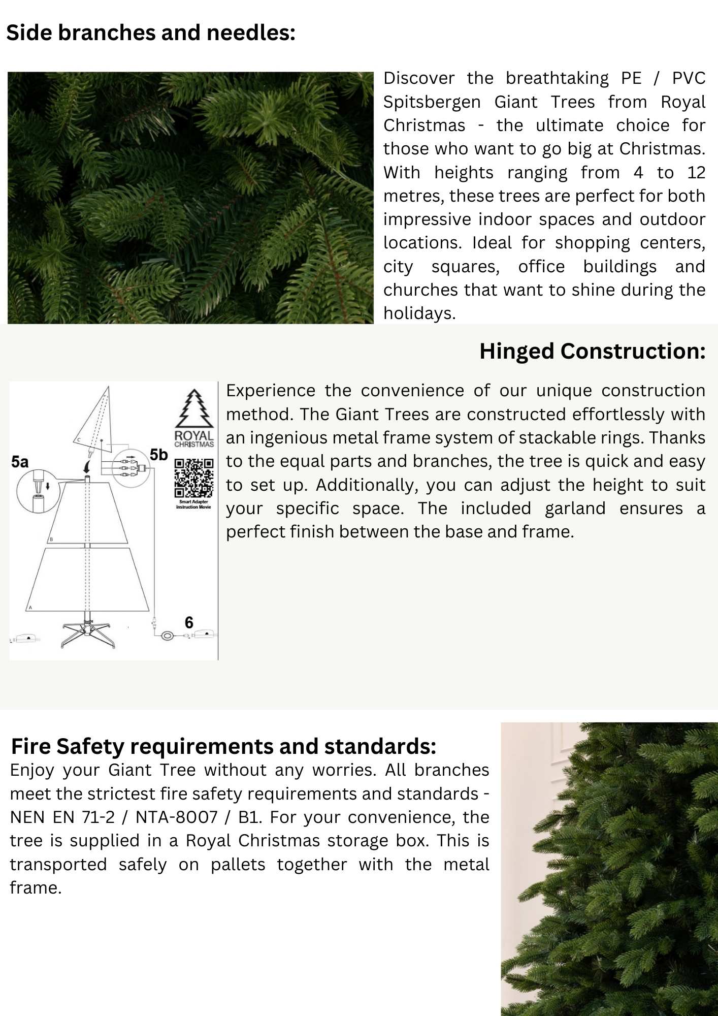 Discover the magnificent Spitsbergen Giant Outdoor Christmas Tree by Royal Christmas, crafted from durable PE/PVC for maximum longevity and weather resistance. Ideal choice for shopping centres, city squares, churches, and large commercial spaces looking to impress during the holidays. With an innovative metal frame of stackable rings, easy assembly, and a decorative garland for a seamless finish, this artificial outdoor Christmas tree is both practical and elegant. Designed with UV resistance, full recyclability, and excellent durability against abrasion, bacteria, and oxidation, it offers not only beauty but also a sustainable investment for the future.