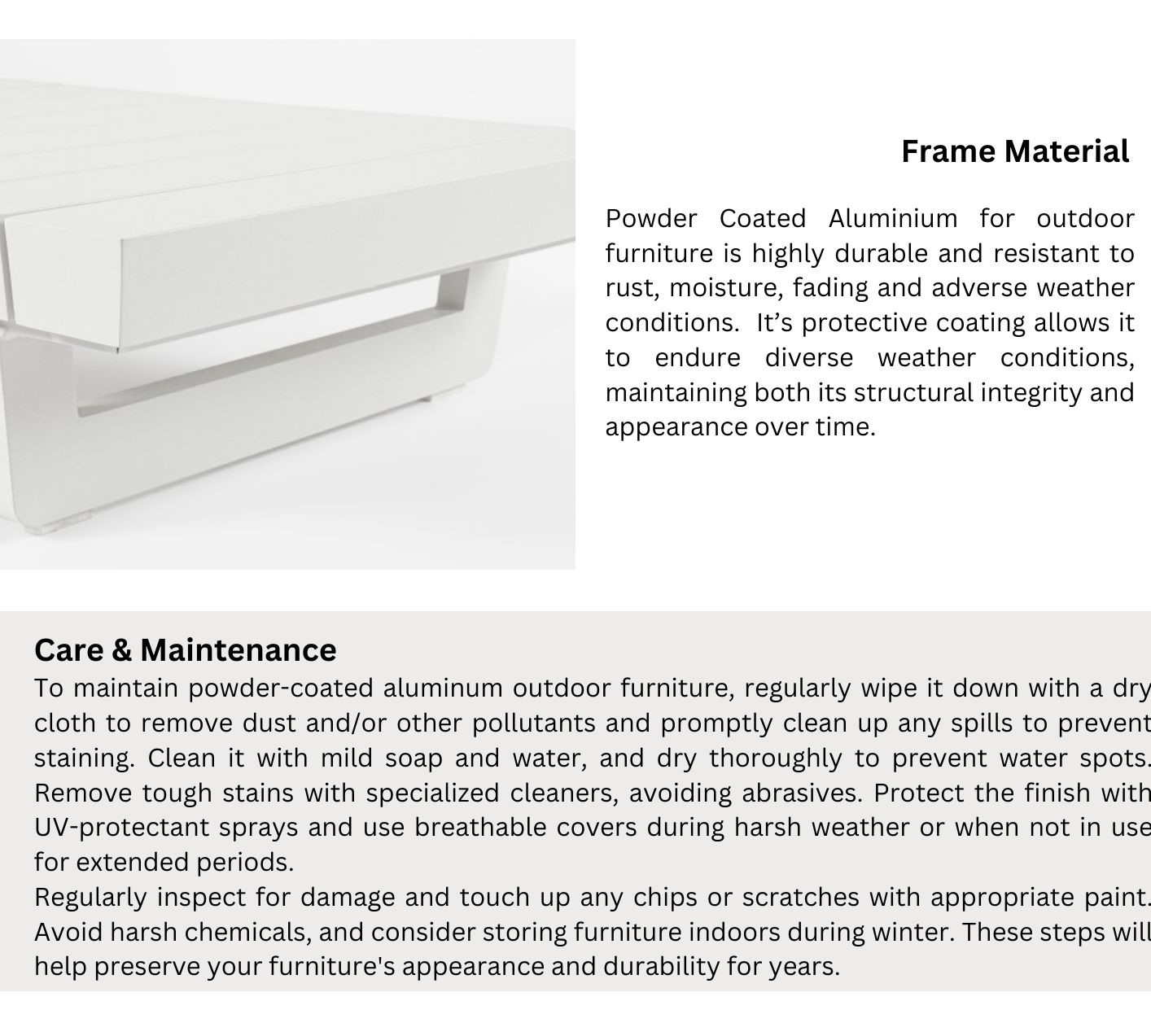 This product is intended for domestic use only. Referring for outdoor furniture build in Aluminium - Powder coated frame / Synthetic Rattan / Teak Wood / Fabric-Robes . In any case, do not use with rain,wind or bad weather: The product is made to act as a lounge sofa/ chair / Table. Cases of wear (rust), distortion and discoloration of all the components of the product which is directly exposed to atmospheric agents, handling and/or daily use, are to be considered as normal and therefore, under no circumstances they will be evaluated as manufanturing defects as such because associated with the normal conditions of use of the item. The Aluminium frames are easy to clean: use a damp and soft cloth. For the most persistant stains, a small amount of mild liquid soap diluted in water may be used. Always dry with a soft cloth after cleaning. Never use aggressive detergents. Never use abrasive sponges that may scratch the surfaces. It is advisable to store the product in a dry and ventilated place before winter or during the long periods it is not in use, in order to preserve its characteristics over time. These cushions can be conveniently detached and machine-washed using a gentle cycle. To maintain a teak wood furniture in good condition, regular maintenance with specialized teak-wood care products and cleaning off dust and dirt may be necessary. Additionally, placing the chair in a space protected from direct sunlight can help preserve the wood's color. Additionally, the seat and back cushions are crafted from waterproof and UV-resistant polyester fabric. These cushions are conveniently removable and can be machine-washed using a gentle cycle. Filling and Covering Fabric pass the 1988 safety regulations (resistant to cigararette and match ignition).