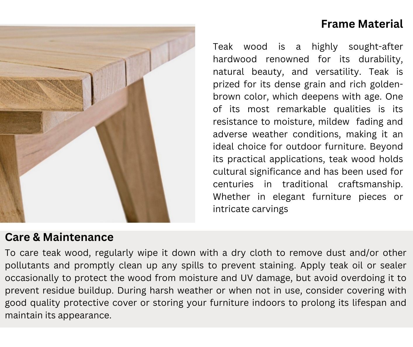 This product is intended for domestic use only. Referring for outdoor furniture build in Aluminium - Powder coated frame / Synthetic Rattan / Teak Wood / Fabric-Robes . In any case, do not use with rain,wind or bad weather: The product is made to act as a lounge sofa/ chair / Table. Cases of wear (rust), distortion and discoloration of all the components of the product which is directly exposed to atmospheric agents, handling and/or daily use, are to be considered as normal and therefore, under no circumstances they will be evaluated as manufanturing defects as such because associated with the normal conditions of use of the item. The Aluminium frames are easy to clean: use a damp and soft cloth. For the most persistant stains, a small amount of mild liquid soap diluted in water may be used. Always dry with a soft cloth after cleaning. Never use aggressive detergents. Never use abrasive sponges that may scratch the surfaces. It is advisable to store the product in a dry and ventilated place before winter or during the long periods it is not in use, in order to preserve its characteristics over time. These cushions can be conveniently detached and machine-washed using a gentle cycle. To maintain a teak wood furniture in good condition, regular maintenance with specialized teak-wood care products and cleaning off dust and dirt may be necessary. Additionally, placing the chair in a space protected from direct sunlight can help preserve the wood's color. Additionally, the seat and back cushions are crafted from waterproof and UV-resistant polyester fabric. These cushions are conveniently removable and can be machine-washed using a gentle cycle. Filling and Covering Fabric pass the 1988 safety regulations (resistant to cigararette and match ignition).