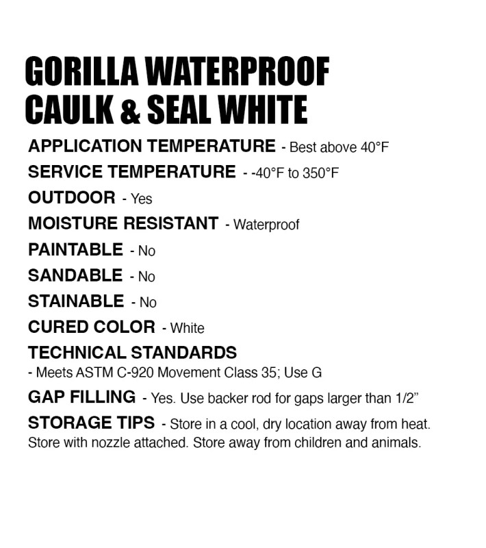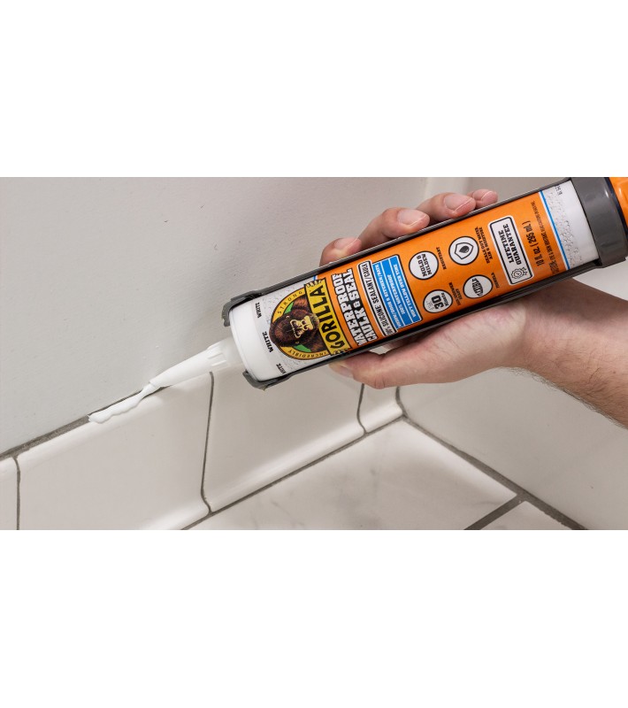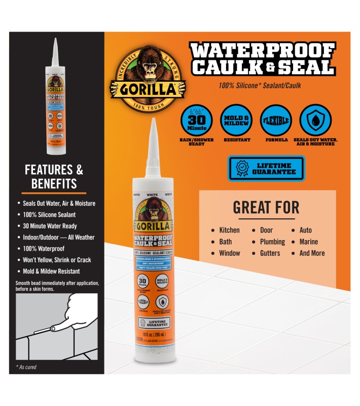 Gorilla Waterproof Caulk & Seal 100% Silicone Sealant* seals out water, air and moisture and is great for kitchen, bath, window, doors, auto, marine, plumbing, gutters and more! Ready for water exposure in just 30 minutes, this waterproof sealant is mold & mildew resistant. The silicone sealant won't yellow, shrink or crack over time!