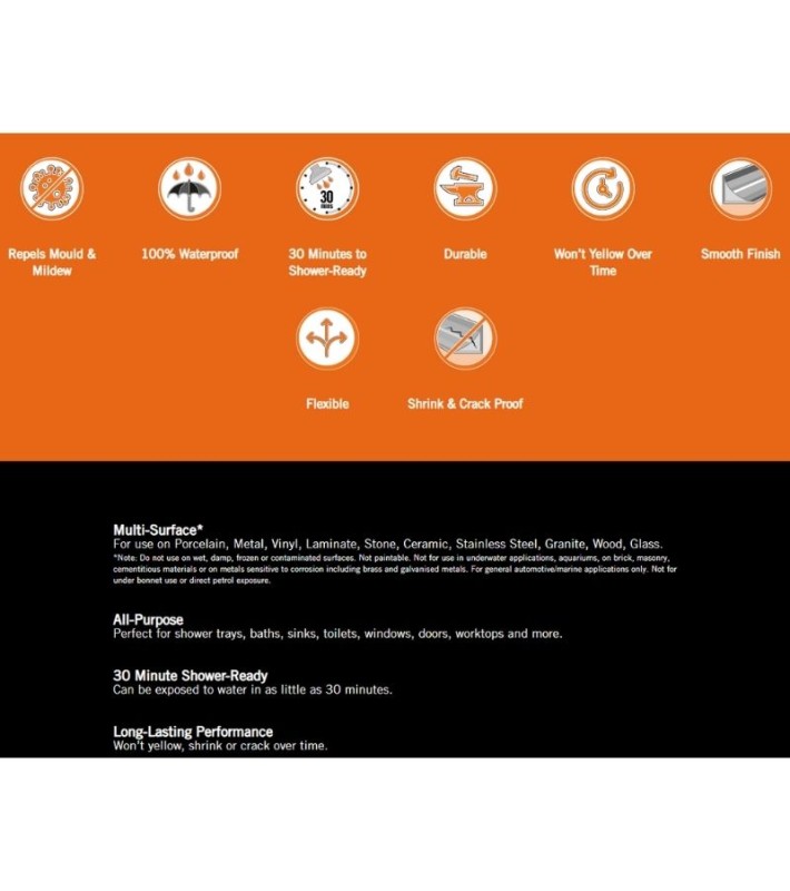 Gorilla Waterproof Caulk & Seal 100% Silicone Sealant* seals out water, air and moisture and is great for kitchen, bath, window, doors, auto, marine, plumbing, gutters and more! Ready for water exposure in just 30 minutes, this waterproof sealant is mold & mildew resistant. The silicone sealant won't yellow, shrink or crack over time!