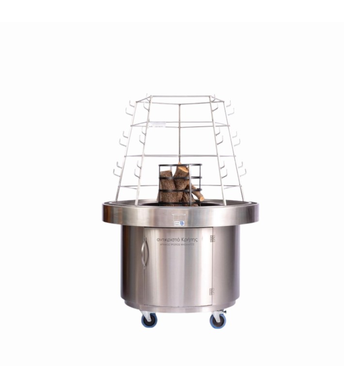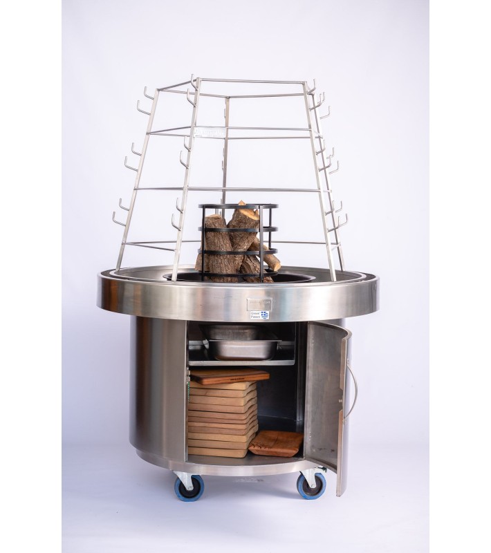The Open-Type INOX Antikristo Grill is an exceptional piece of equipment for cooking meat over an open fire, designed to offer a unique grilling experience in outdoor spaces. The traditional Antikristo cooking method uses wood, with a specially designed circular, manually rotating spit that slowly and evenly rotates above the fire, ensuring the ideal roasting process. The ventilation and precise temperature control provided by the grill allow the meat to cook evenly and to perfection. The dimensions of D125xH170cm make it ideal for grilling large quantities of meat. The Antikristo grill features a circular manually rotating spit with 15 cooking positions and 18 skewers, a dedicated skewer holder, a firewood compartment, a charcoal collector, and a wind-protection screen (Panemidi) for windy conditions. It also includes a water grease collector at the base. The lower section of the grill is equipped with an integrated wheeled INOX base with storage space and a thermal chamber. The Antikristo grill set includes heat-resistant gloves for safe handling, a shovel for easy collection and transport of charcoal, meat-cutting scissors for precise cutting, an apron for clothing protection, and a wooden platter for easy transfer of grilled meats. This Antikristo grill is the perfect choice for professionals or barbecue enthusiasts who want to enjoy traditional open-fire grilling with ease and outstanding results.