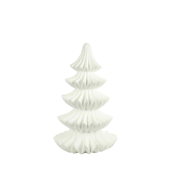 Its multi-layered sculpted design, reminiscent of a snow-covered pine, is crafted from ceramic material, adding a fresh and festive ambiance that stands out in any space.