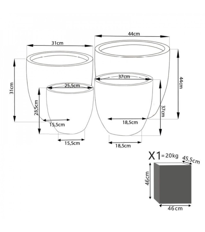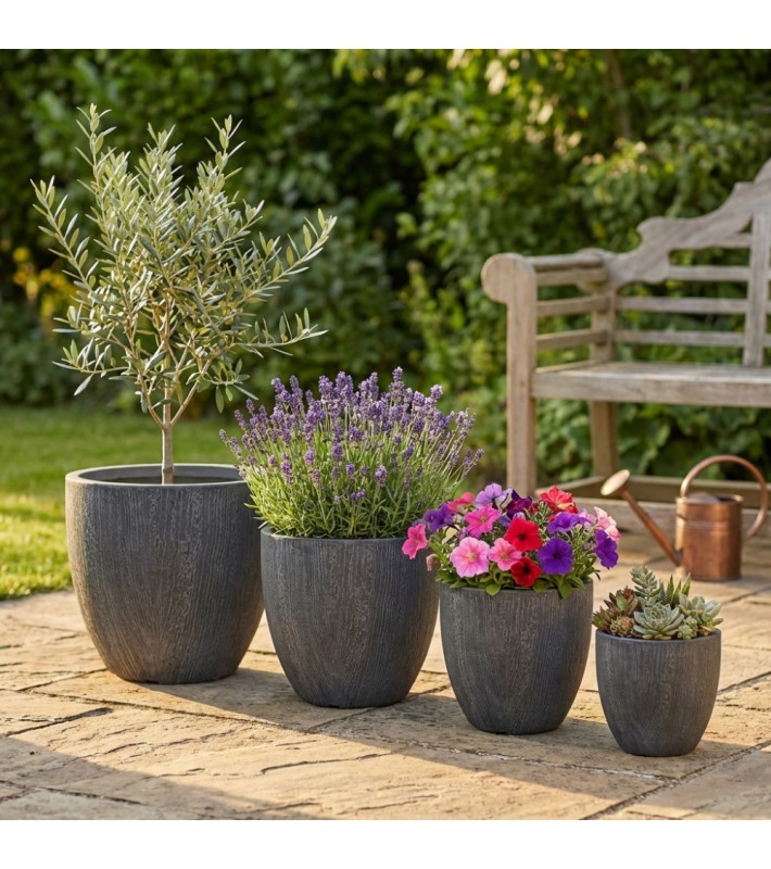 The Dahlia flower pot set in grey is a stylish and practical solution for both indoor and outdoor decoration. The set includes 4 vases made of durable synthetic fibre, suitable for gardens, terraces, and commercial spaces. The woven texture offers a natural aesthetic, while the grey finish complements modern and minimalist settings. The variety of sizes allows for creative plant arrangements, adding height and depth to any decorative composition. Dimensions: G: 44x44x43 cm, M: 37x37x35 cm, D: 31x31x30.5 cm, XS: 25.5x25.5x25 cm. An ideal choice for those seeking durable outdoor plant pots with contemporary design.