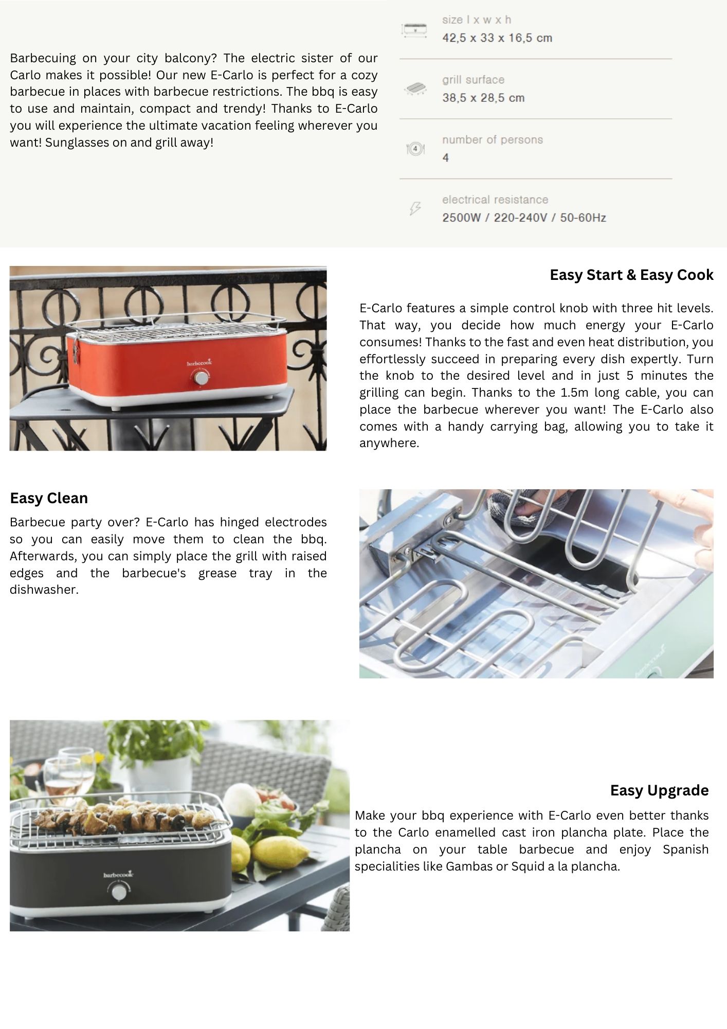 Barbecuing on your city balcony? The electric sister of our Carlo makes it possible! Our new E-Carlo is perfect for a cozy barbecue in places with barbecue restrictions. The bbq is easy to use and maintain, compact and trendy! Thanks to E-Carlo you will experience the ultimate vacation feeling wherever you want! Sunglasses on and grill away! Available in 3 colors, green, Red, Charcoal. Thanks to the fast and even heat distribution, you effortlessly succeed in preparing every dish expertly. Turn the knob to the desired level and in just 5 minutes the grilling can begin. Thanks to the 1.5m long cable, you can place the barbecue wherever you want! The E-Carlo also comes with a handy carrying bag, allowing you to take it anywhere.