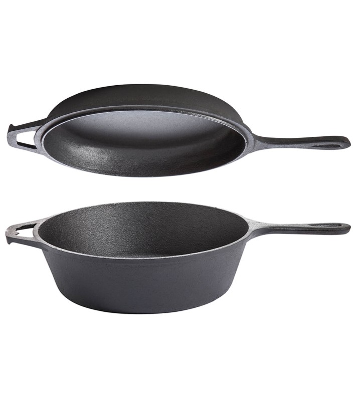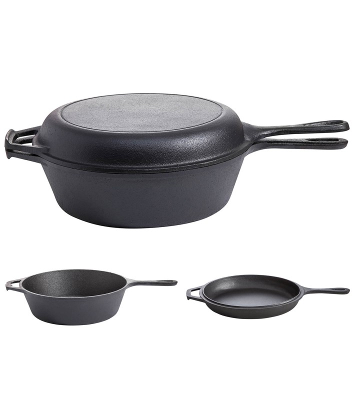 Παρουσιάζουμε τον συνδυασμό 2 σε 1 - χυτοσίδηρος κατσαρόλα/τηγάνι με λαβή και καπάκι. Κατασκευασμένος από χυτοσίδηρο, χωρίς χρώμα, αλλά μόνο με φυσική χυτευτική επιφάνεια που έχει επεξεργαστεί με λάδι. Διαθέτει δύο μεγέθη: διάμετρος 25,5 εκατοστά και 24,5 εκατοστά, με ύψος τριγύρω περίπου 7,5 εκατοστά και 4 εκατοστά αντίστοιχα. Μήκος με τη λαβή 42 εκατοστά. Ο συνδυασμός αυτός είναι ανθεκτικός και δυνατός, παρέχοντας καλή αποθήκευση και διανομή της θερμότητας, και εξοικονομώντας ενέργεια. Επιπλέον, είναι εύκολος στον καθαρισμό. Αυτός ο συνδυασμός αποτελείται από τηγάνι, κατσαρόλα και καπάκι, με τον όγκο της κατσαρόλας να φτάνει τα 3,5 λίτρα και τον όγκο του καπακιού να είναι 1,5 λίτρο.