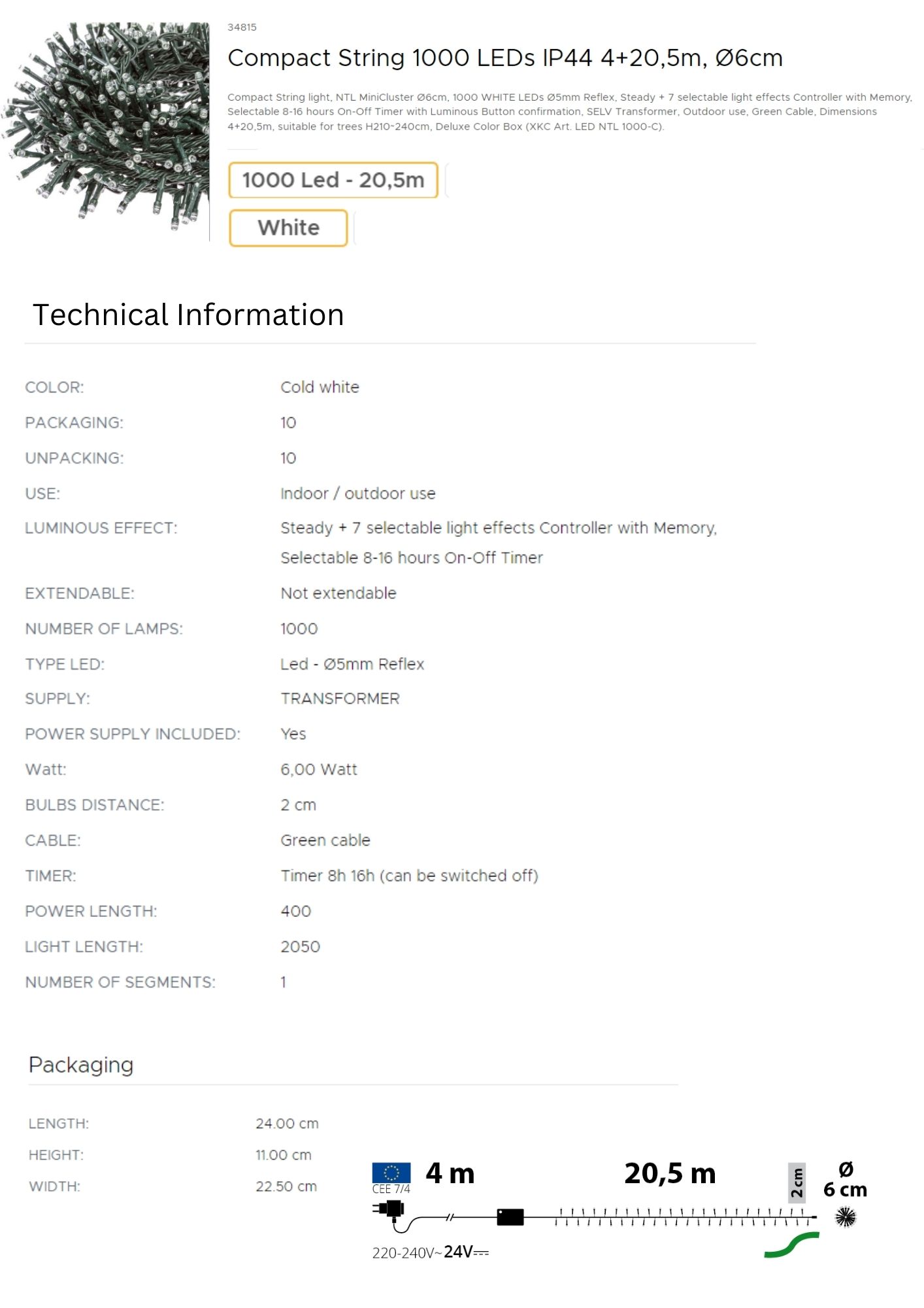 String LED Lights - Cold White with Green Cable - 20,5+4m (1000 LED)