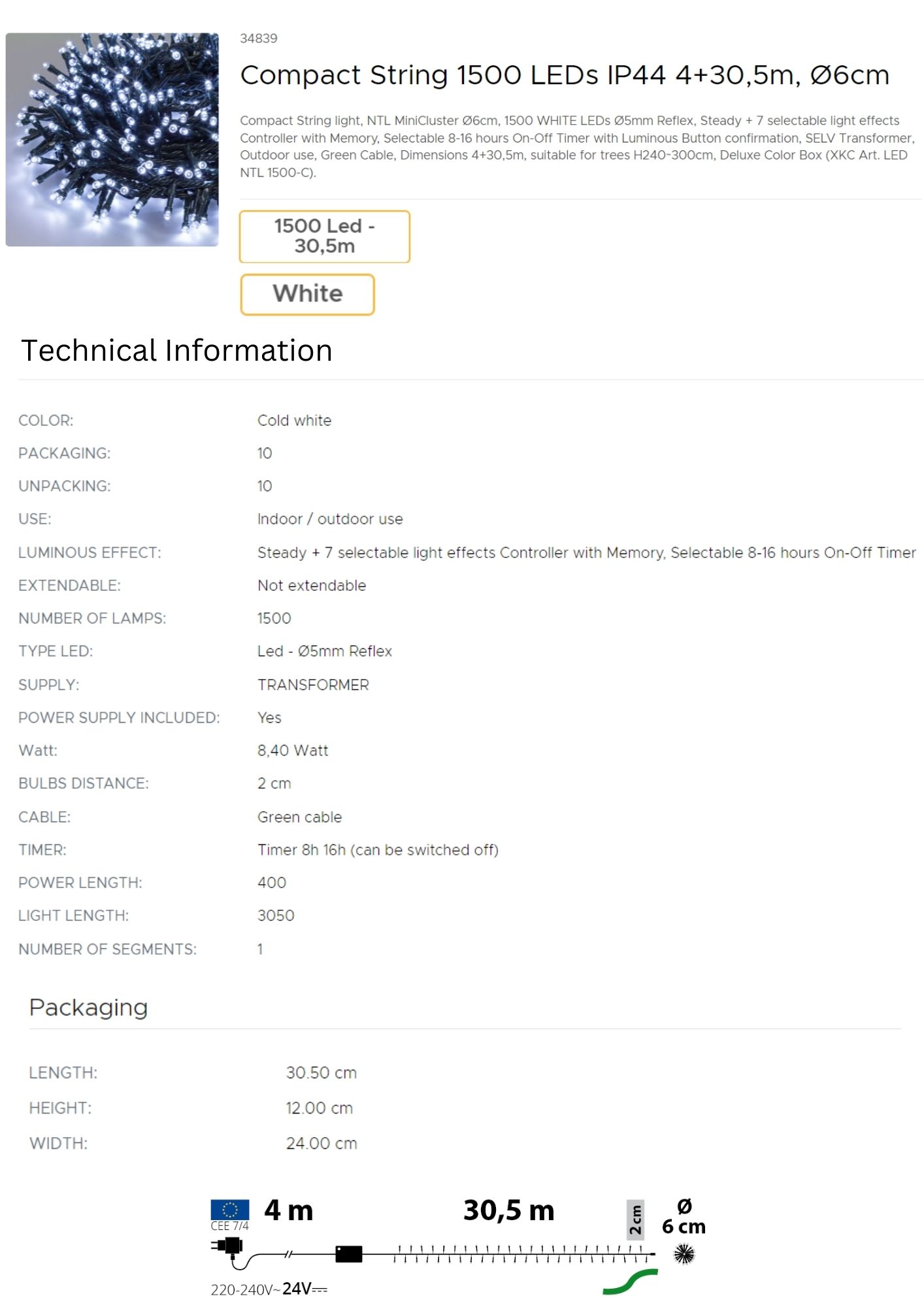 String LED Lights - Cold White with Green Cable - 30,5+4m (1500 LED)